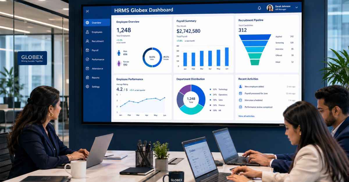 This is where HRMS Globex becomes important. It is a complete human resource management system that helps businesses manage recruitment, payroll, performance, and employee experience in one simple platform. Instead of using spreadsheets or paperwork, companies can automate everything.